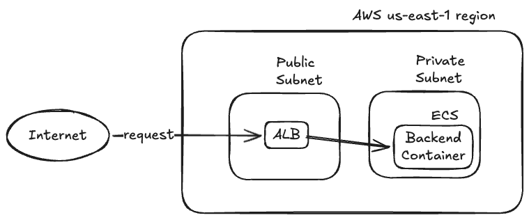At a high level, we want to run our backend server in a container running in ECS Fargate. The backend server must run in a private subnet to prevent unwanted access. An ALB is required in a public subnet for requests to come in, and the ALB should forward those requests to the backend server.